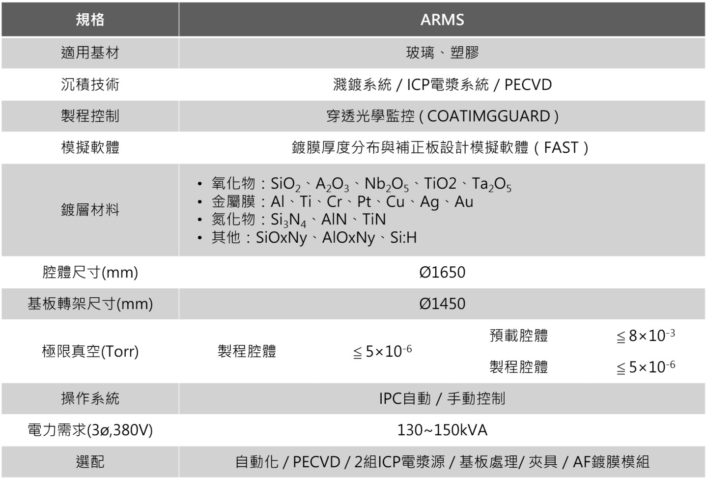 - 全機全自動化控制(IPC & PLC),可鍍製高階光學膜與複合式多層膜光學鍍膜。