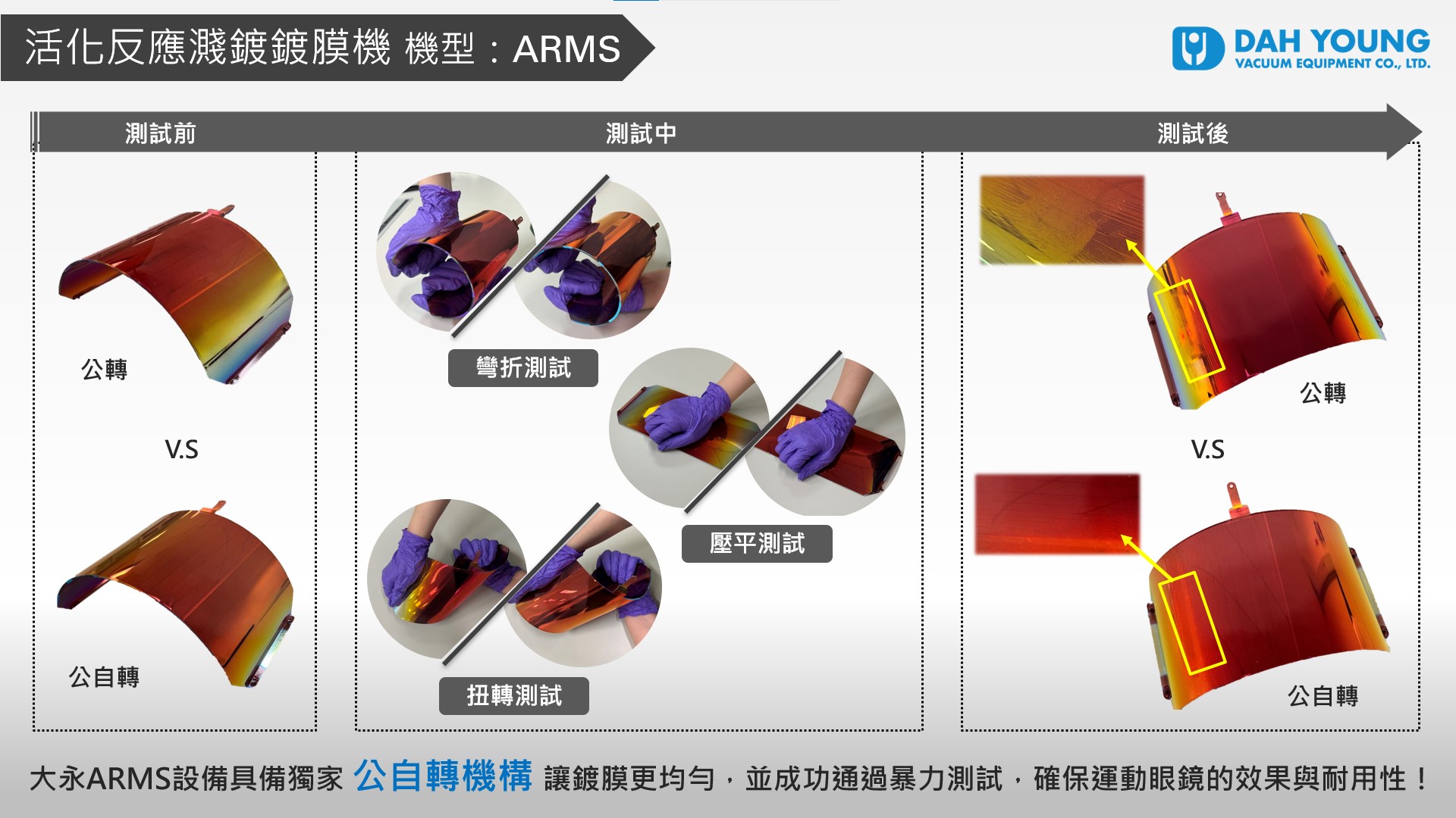 大永ARMS設備具備獨家公自轉機構讓鍍膜更均勻,並成功通過暴力測試,確保運動眼鏡的效果與耐用性。