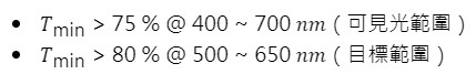 Low-E 濾光片製程中不需要加熱便可製備具透明導電膜功能(例如,電磁波屏蔽、加熱除霧、觸控、透明天線等),且於可見光波段具有高穿透率之薄膜。