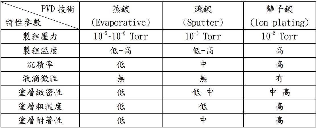 不同的PVD技術的製程參數與塗層性質會有所差異[2](如表一所示),可根據欲開發之塗層材料選擇適當的PVD技術,達到塗層性質最佳化。