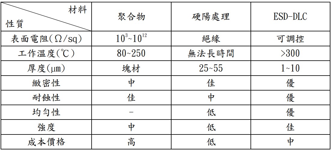 表二、傳統靜電消散材料與ESD-DLC性質比較表