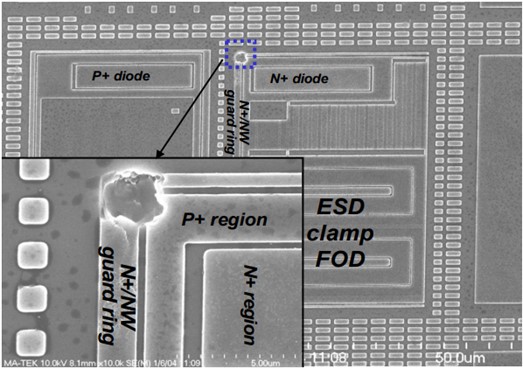 圖一、靜電放電導致電子元件損壞之SEM圖[1]