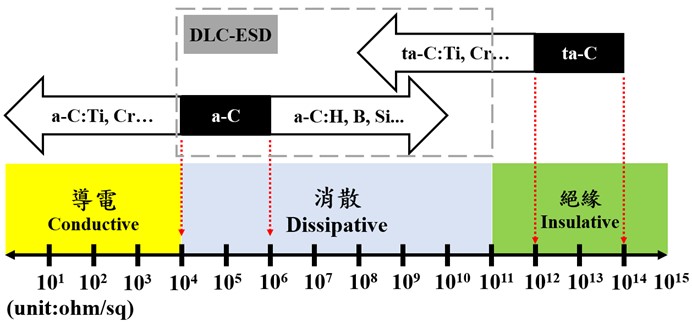 根據ANSI/ESD S541的標準[3],當材料電阻低於104 Ω/sq具有導電性(conductive),介於104~1011 Ω/sq具有消散性(dissipative),高於1011 Ω/sq具有絕緣性(insulative)。類鑽碳塗層(DLC)在氫含量低於5%且不摻雜金屬元素的條件下,不同sp3鍵結百分比(x)可分成非晶碳(a-C, x < 50%)與四面體非晶碳(ta-C, x > 50%)[4]。研究文獻指出,a-C的電阻範圍約104~106 Ω/sq[5],ta-C的電阻範圍約1012 Ω/sq以上[6],由此發現DLC塗層的片電阻會受到sp3鍵結百分比所影響。除了控制ESD-DLC塗層的sp3百分比之外,也可能以摻雜(doped)氫氣(H)、金屬元素鈦(Ti)、鉻(Cr)或非金屬元素硼(B)、矽(Si)來調控電阻值,同時可根據工件材料種類優化ESD-DLC塗層的機械性質、附著性與耐蝕性。