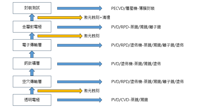 • 載子傳輸過程:激子解離後形成的自由載子,其中自由電子透過電洞傳輸層向陽極傳輸。
