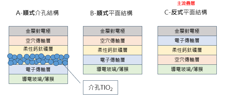 • 柔性鈣鈦礦:置於中心位置,主要負責吸收光能量,並生成載流子;甲胺碘化鉛(MAPbI3)和甲脒碘化鉛(FAPbI3)等等。