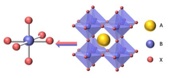 • ABX3屬於四方晶系。1個金屬-B原子與6個鹵素-X原子配位形成[BX6]八面體結構,A原子被周圍的共享頂點的8個八面體骨架包圍在較弱的范德華力相互作用下保持結構穩定。