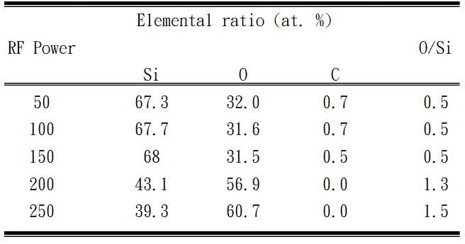 表二,電漿功率變化對氧化矽膜材之表面元素含量