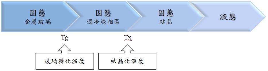 金屬玻璃也具優秀的可塑性。在加熱金屬玻璃使其成為液態的過程中,會先達到玻璃轉化溫度(Tg)及結晶化溫度(Tx)。而溫度於Tg與Tx間,又稱為過冷液相區,相位轉換對於溫度的關係如圖二所示。此時其會呈現類似液態金屬之狀態,可塑性極高,可藉由吹塑形成普通金屬無法實現之外型,雖然材料成本較高,但加工費卻相當於塑膠一樣低廉,且其強度較一般鋼鐵高出2倍。